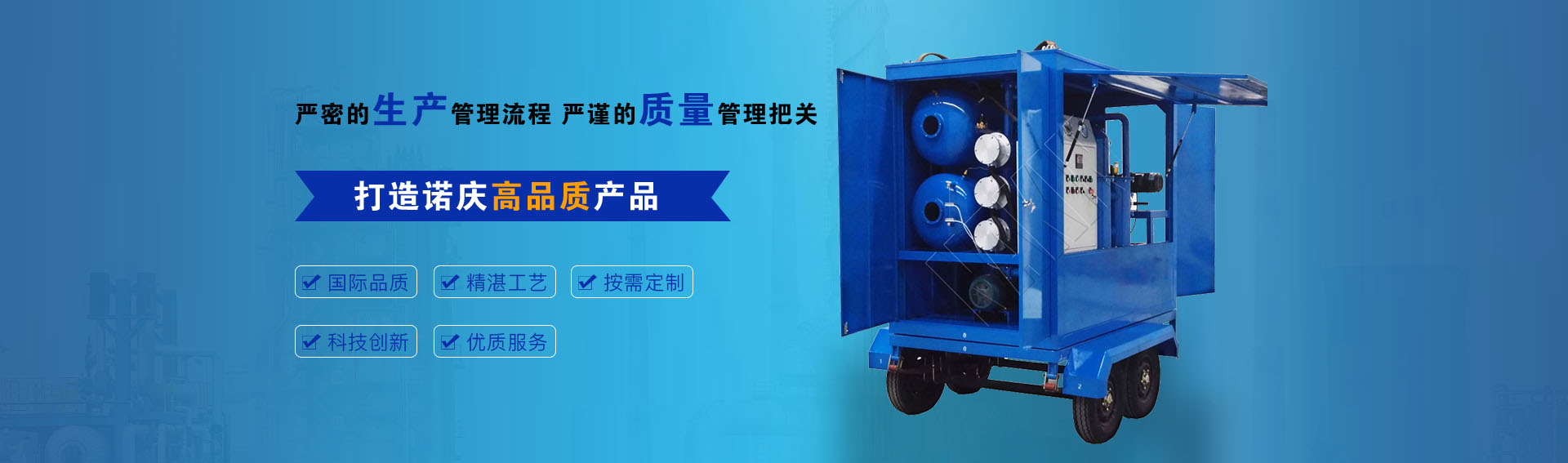 公司通過ISO9001-2015質(zhì)量管理體系認證,CE歐盟認證,諾慶公司所有濾油機配套產(chǎn)品均采用國內(nèi)外知名品牌,經(jīng)過多年的使用,具有質(zhì)量可靠,性能優(yōu)良。公司擁有完備的檢測儀器和檢測設(shè)備,所有產(chǎn)品出廠前經(jīng)過嚴格測試,保證每一臺產(chǎn)品合格出廠。生產(chǎn)實力雄厚
